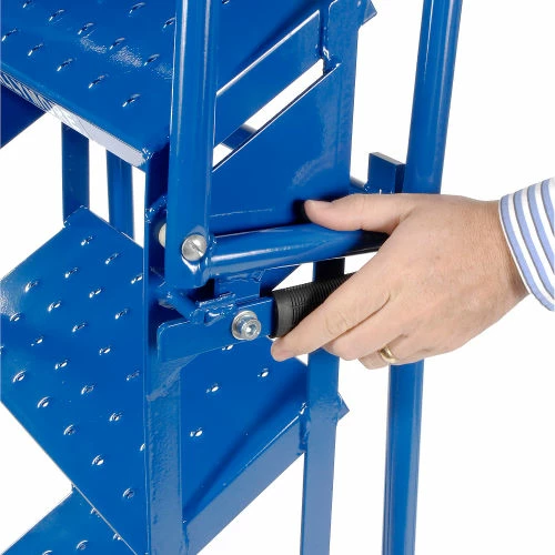 Simply fold & roll these step ladders where and when you need it! These heavy duty welded steel ladders are rated to withstand 350 lbs. Folds to only 10″D for compact storage. Rolling ladders lock in folded or open position for operator safety. These steel ladders have a 58 degree slope with 7″D steps for easy climbing. Folding ladders measure 24″W. Blue powder coat finish. Meets ANSI 14.2 standards. Folded Size: 10″ x 24″ x 65″
