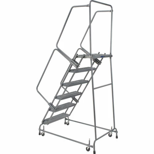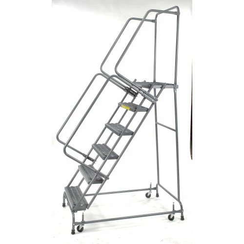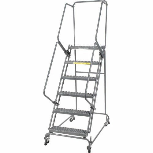 Perfect for use in warehouse, stockroom and maintenance areas. Built to take heavy everyday use. Increase productivity quickly by taking the ladder where the work is. Fast, easy assembly. 14″ deep top step and handrail. Lock has spring loaded casters that retract when stepping on ladder; rubber feet grip floor. Ladder rolls freely after you step off.