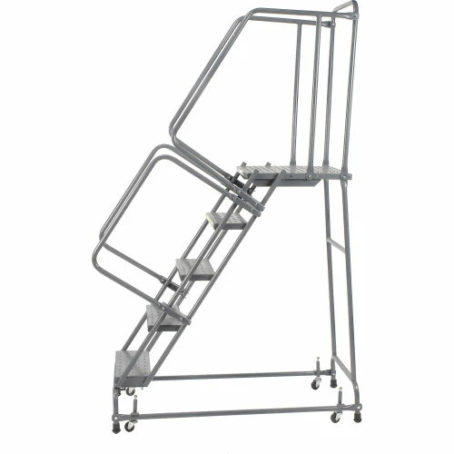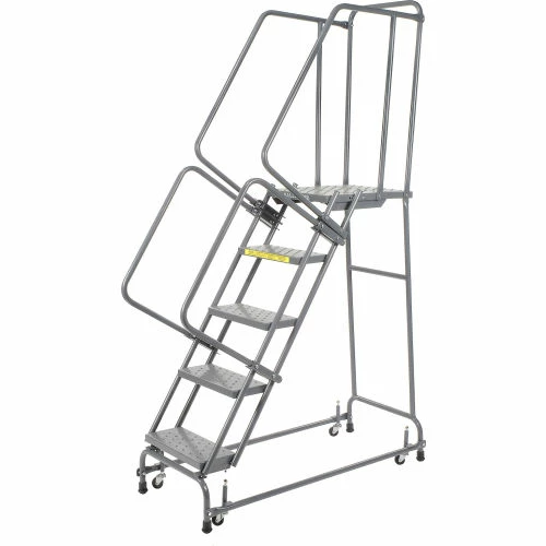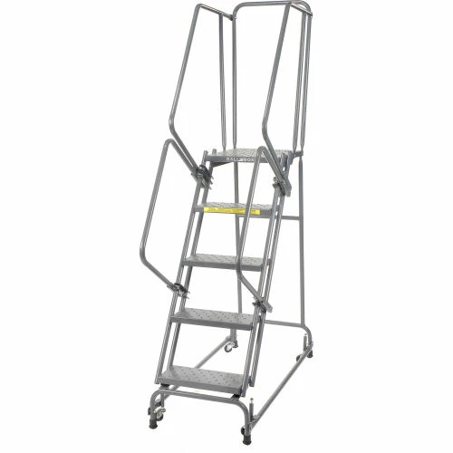Perfect for use in warehouse, stockroom and maintenance areas. Built to take heavy everyday use. Increase productivity quickly by taking the ladder where the work is. Fast, easy assembly. 21″ deep top step. Lock has spring loaded casters that retract when stepping on ladder; rubber feet grip floor. Ladder rolls freely after you step off.