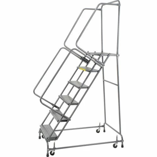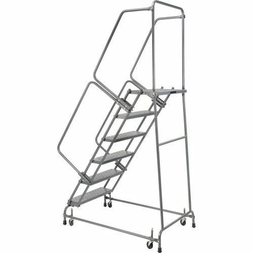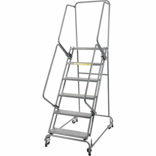 Perfect for use in warehouse, stockroom and maintenance areas. Built to take heavy everyday use. Increase productivity quickly by taking the ladder where the work is. Fast, easy assembly. 14″ deep top step and handrail. Lock has spring loaded casters that retract when stepping on ladder; rubber feet grip floor. Ladder rolls freely after you step off.