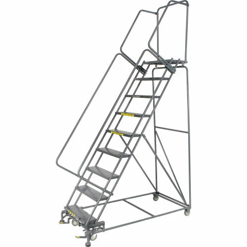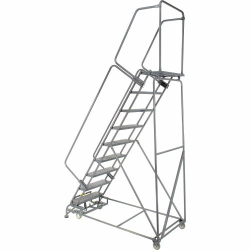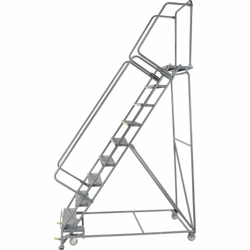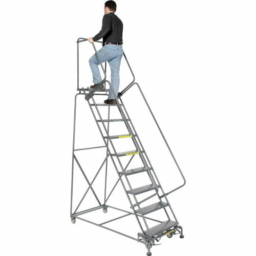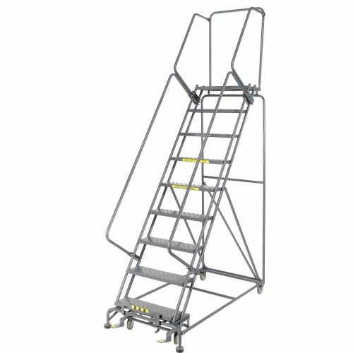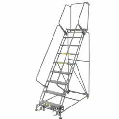 Perfect for use in warehouse, stockroom and maintenance areas. Built to take heavy everyday use. Increase productivity quickly by taking the ladder where the work is. Fast, easy assembly. 14″ deep top step. Lock works by stepping on bottom step to raise casters; rubber feet grip floor. Depress brake release to roll ladder.
