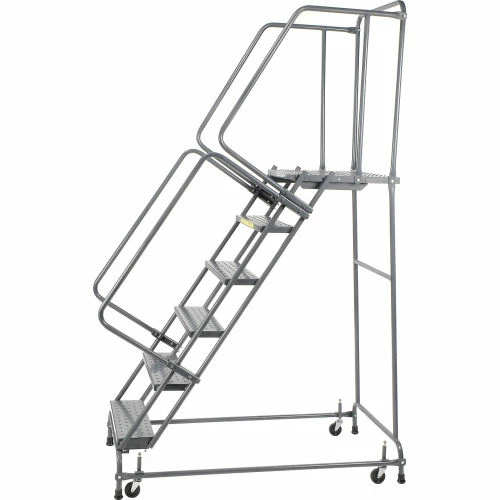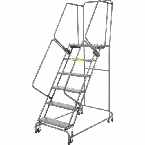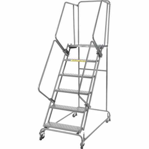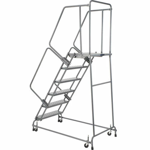 Perfect for use in warehouse, stockroom and maintenance areas. Built to take heavy everyday use. Increase productivity quickly by taking the ladder where the work is. Fast, easy assembly. 14″ deep top step and handrail. Lock has spring loaded casters that retract when stepping on ladder; rubber feet grip floor. Ladder rolls freely after you step off.
