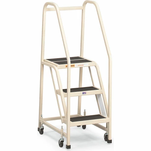 Built with 100% square tube framework for a clean look. 450 lbs capacity. Rigid 1″ square tubing. Spring loaded 3″ casters provide mobility while rubber tipped legs add traction while In use. 16″ wide steps and a 24″ high handrail. Steps are 7″ deep with a deeper 14″ top step. Solid treads covered with nonslip adhesive runner. Meets OSHA standards.
