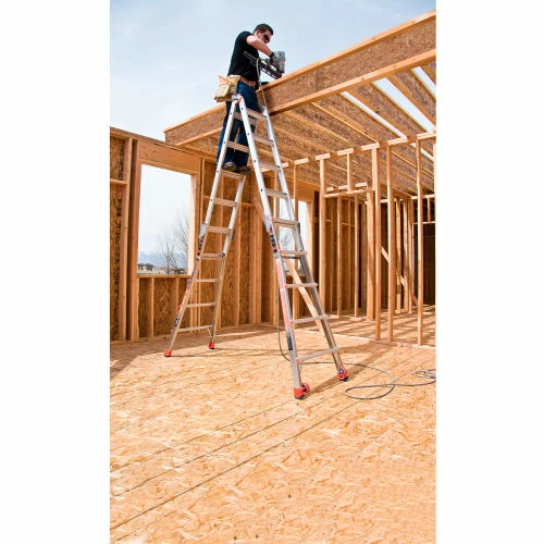 The Revolution XE can be used in 24 unique configurations, as an A-frame, extension, staircase and 90-degree ladder, and as a trestle-and-plank scaffolding system. The Revolution XE’s wide-flared legs and aerospace-grade aluminum construction provide an unmatched feeling of safety and stability. Rated to hold 300 lbs. on both sides and is a true two-person ladder. Allows you to work over uneven surfaces safely, and is easy to store and carry. 11 to 19 foot extension. Complies with all applicable OSHA requirements and ANSI 14.2 standards.