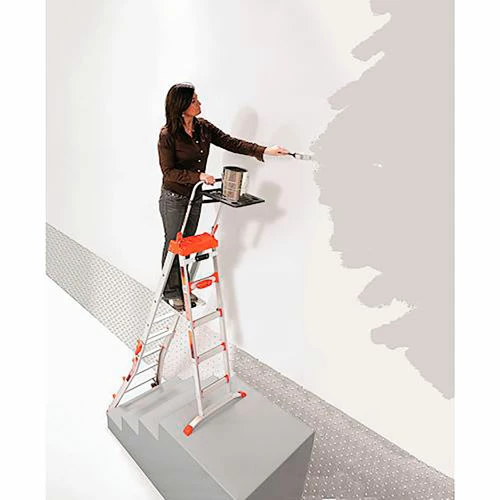 The patent-pending SelectStep provides a comfortable standing platform that offers heel-to-toe foot support at the top recommended step. Safe to use on staircases and uneven surfaces. Lightweight design with wheels makes ladder easy to move quickly from job to job. AirDeck includes magnetic tray, drill holder, paint holder and power cord slot. 8′ extension. Complies with all applicable OSHA requirements and ANSI 14.2 standards.
