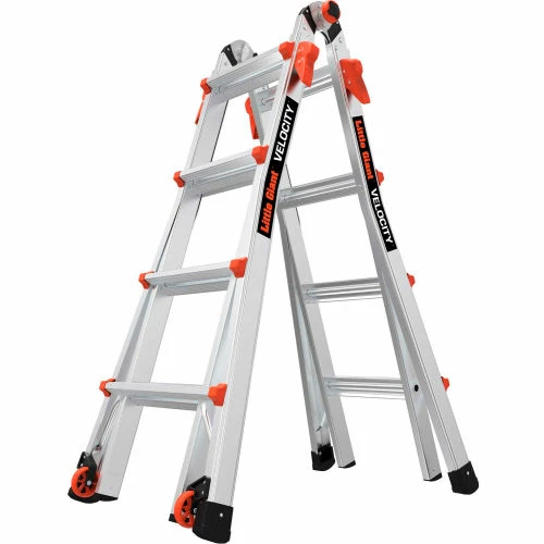 The Little Giant Velocity is constructed of a special alloy that makes it 20 percent lighter than any comparable industrial-rated ladder. The Velocity also includes several innovative new features such as the dual-pin hinge and the easy-to-use Rock Locks for quick adjustment. The Velocity can be used in many unique configurations as an A-frame, extension, staircase and 90-degree ladder, and with Velocity Trestle Brackets (sold separately) to form a trestle-and-plank scaffolding system. The Velocity’s wide-flared legs and aerospace-grade aluminum construction provide an unmatched feeling of safety and stability. The Little Giant Velocity is rated to hold 300 pounds on both sides and is a true two-person ladder. Complies with all applicable OSHA requirements and ANSI 14.2 standards.