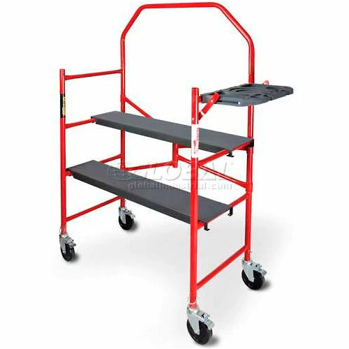 The 4 ft. Metaltech Buildman portable scaffold is the perfect solution for all your indoor painting and maintenance applications. It features a robust 750 lbs. load capacity, yet is lightweight, easy to transport and handle. When not in use, it conveniently folds down making it easy to store. This unit contains two sets of gray 14 gauge steel anti slip platforms for a multi-level working area. Adjust the two steel platforms on the bottom rungs and you can even use this as a storage cart to haul your equipment and heavy loads to and from the jobsite. Rugged 1-1/4 inch steel tube frame construction is secure and safe (includes safety rail) with 5 in. swivel casters with double-locking brakes and solid steel stem. The convenient tool shelf is designed to hold all your tools, screwdriver bits, both quart and gallon paint cans. The whole tool shelf will easily fold out of the way when your job is completed. Meets OSHA and CSA requirements.