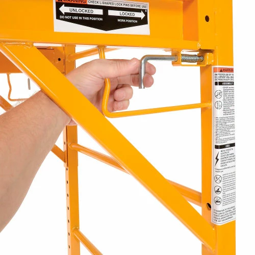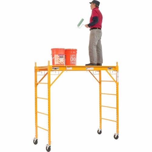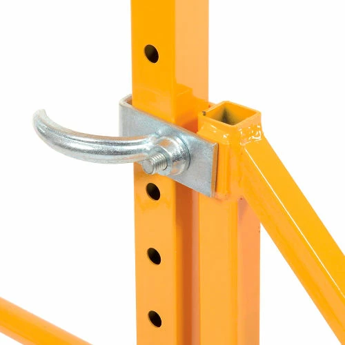 Rugged 1-1/2″ square tubular steel construction. Height can be adjusted by a single user easily and without tools at 4″ increments. Height adjustment mechanism is surrounded by a protective D-ring for safety. The four 5″ swivel casters will not roll or swivel when locked. Rungs spaced on 12″ centers. Optional handrail/toeboard kit available. See Accessories model 309104. UL listed.