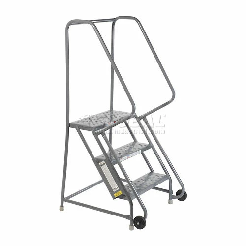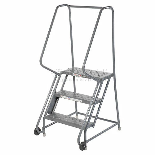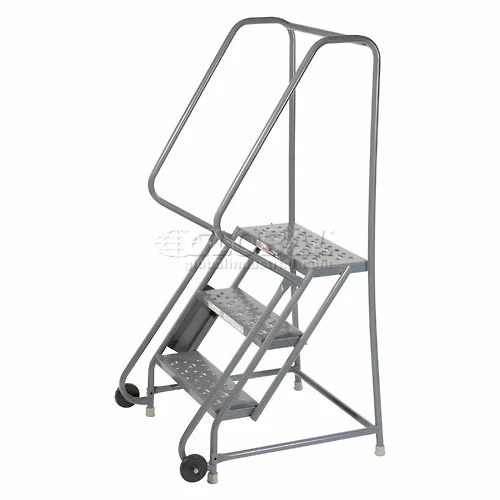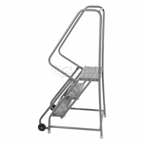 Heavy-duty 1-1/16″ steel tubing makes this ladder ideal for warehouse use, stock picking or maintenance operations. This Perforated Step model has steel steps with slip-resistant openings for added traction. Tilt ladder forward on two 4″ wheels to move from job to job. 4 large rubber end caps protect floor surfaces. 7″ deep steps, 10″ deep top platform and 42″ handrails provide sure footing for safe, worry-free use. Meets OSHA requirements. Powder coat finish. 450 lb. capacity.