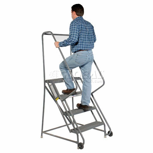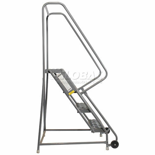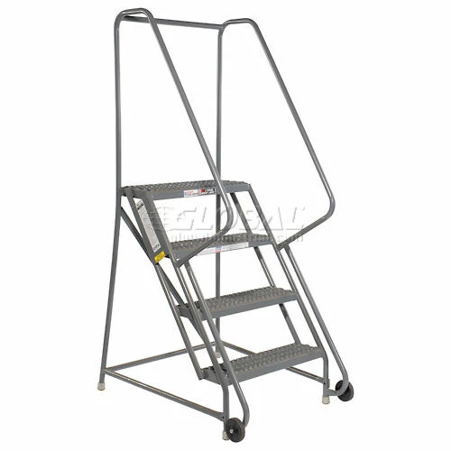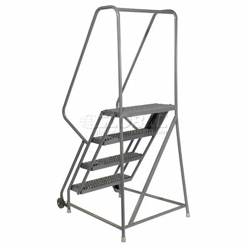 Heavy-duty 1-1/16″ steel tubing makes this ladder ideal for warehouse use, stock picking or maintenance operations. This Grip Strut model has expanded steel steps for maximum traction and excellent ventilation that allows steps to dry efficiently. Tilt ladder forward on two 4″ wheels to move from job to job. 4 large rubber end caps protect floor surfaces. 7″ deep steps, 10″ deep top platform and 42″ handrails provide sure footing for safe, worry-free use. Meets OSHA requirements. Powder coat finish. 450 lb. capacity.