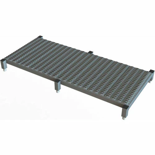 Platform height adjusts to ideal working height. Simply turn the nuts at the bottom of the threaded legs. Make uneven surfaces level. Place several units together for large areas. Grip Strut® surface helps prevent slips. Platforms 26″- 48″ long have 4 legs, others have 6. Gray powder coat finish. 24″ W. Meets OSHA and ANSI standards.