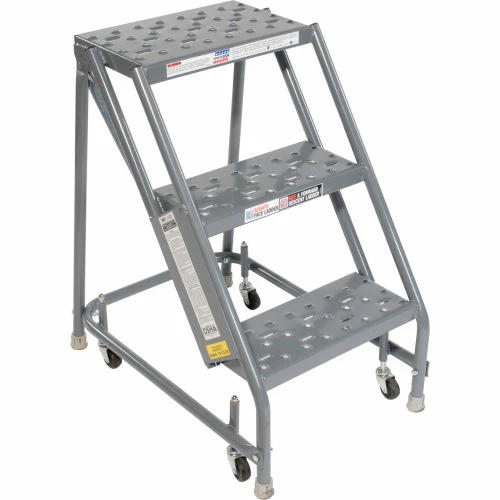 Industrial Quality at an Economical Price Ideal for warehouse, stockroom, office and maintenance areas. 1 1/16″ heavy-duty construction, 7″ deep steps and rubber-tipped feet for stability and safety. Lock has spring loaded casters that retract when stepping on ladder; rubber feet grip floor. Ladder rolls freely after you step off. Powder coat finish. Meets OSHA requirements.