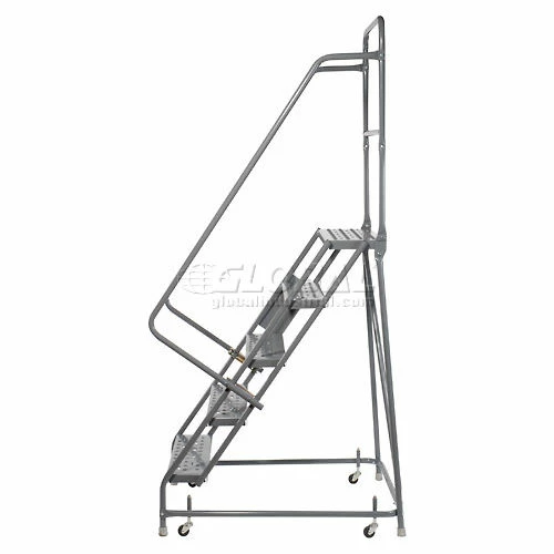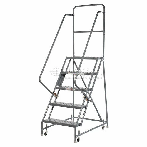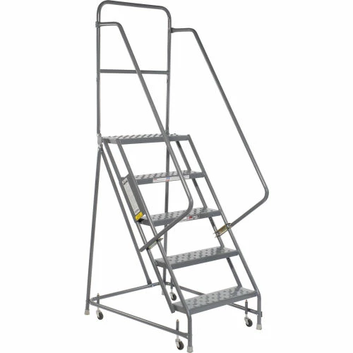 Industrial Quality at an Economical Price Ideal for warehouse, stockroom, office and maintenance areas. 1-1/16″ heavy-duty construction, 7″ deep steps and rubber-tipped feet for stability and safety. 42″ high handrails. Lock has spring loaded casters that retract when stepping on ladder; rubber feet grip floor. Ladder rolls freely after you step off. Powder coat finish. Meets OSHA requirements.