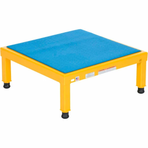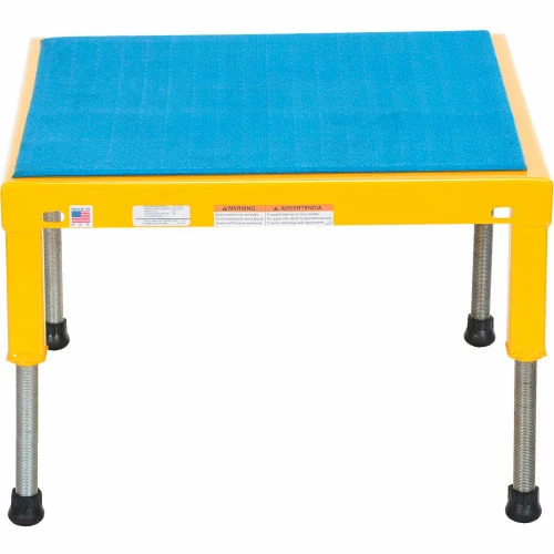 Minimizes fatigue by elevating workers to heights that are comfortable and ergonomically correct. Especially useful when multiple shift employees operate the same piece of machinery. Ergonomic matting deck style provides comfort for the operator who stands all day. The height of each leg can be adjusted individually to ensure proper working height. All sizes have four legs. Powder coated safety yellow finish. Welded steel construction.