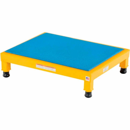 Minimizes fatigue by elevating workers to heights that are comfortable and ergonomically correct. Especially useful when multiple shift employees operate the same piece of machinery. Ergonomic matting deck style provides comfort for the operator who stands all day. The height of each leg can be adjusted individually to ensure proper working height. All sizes have four legs. Powder coated safety yellow finish. Welded steel construction.