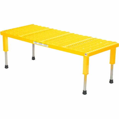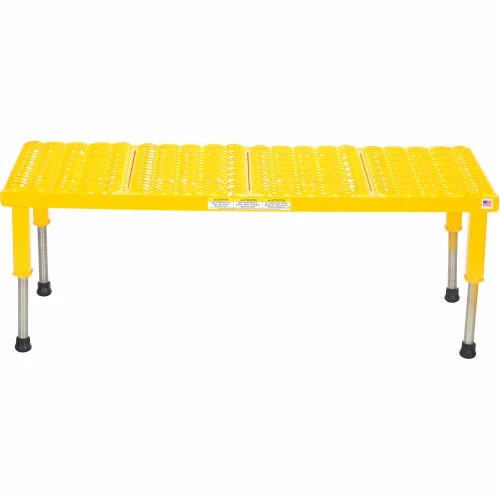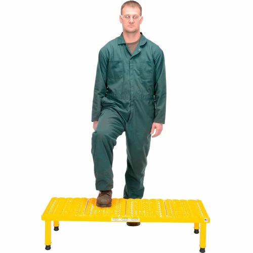 Minimizes fatigue by elevating workers to heights that are comfortable and ergonomically correct. Especially useful when multiple shift employees operate the same piece of machinery. Serrated style platforms ensure safe footing in most wet environments. The height of each leg can be adjusted individually to ensure proper working height. All sizes have four legs. Powder coated safety yellow finish. Welded steel construction.