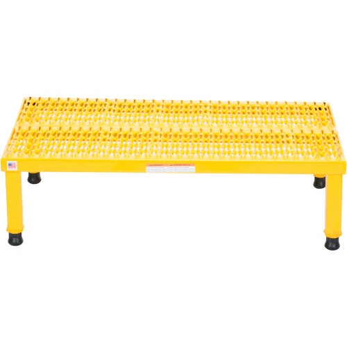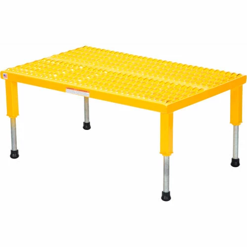 Minimizes fatigue by elevating workers to heights that are comfortable and ergonomically correct. Especially useful when multiple shift employees operate the same piece of machinery. Serrated style platforms ensure safe footing in most wet environments. The height of each leg can be adjusted individually to ensure proper working height. All sizes have four legs. Powder coated safety yellow finish. Welded steel construction.
