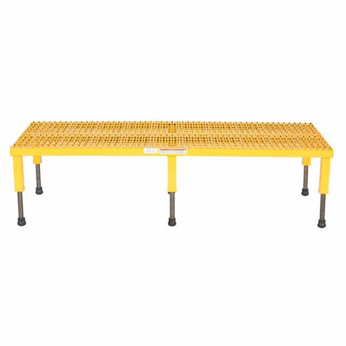 Minimizes fatigue by elevating workers to heights that are comfortable and ergonomically correct. Especially useful when multiple shift employees operate the same piece of machinery. Serrated style platforms ensure safe footing in most wet environments. The height of each leg can be adjusted individually to ensure proper working height. All sizes have four legs except the 60″,72″, & 96″ long models which have six legs. Powder coated safety yellow finish. Welded steel construction.