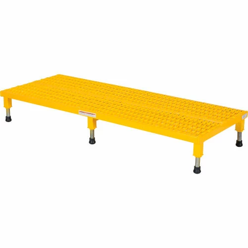 Minimizes fatigue by elevating workers to heights that are comfortable and ergonomically correct. Especially useful when multiple shift employees operate the same piece of machinery. Serrated style platforms ensure safe footing in most wet environments. The height of each leg can be adjusted individually to ensure proper working height. All sizes have four legs except the 60″,72″, & 96″ long models which have six legs. Powder coated safety yellow finish. Welded steel construction.