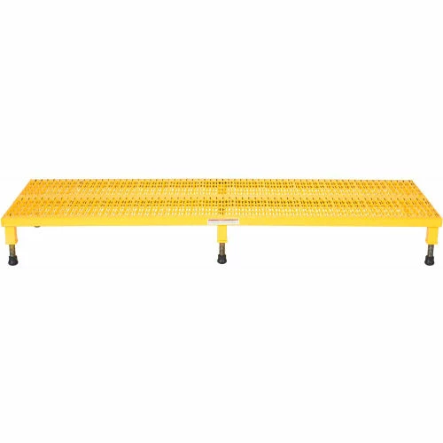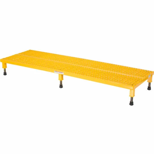 Minimizes fatigue by elevating workers to heights that are comfortable and ergonomically correct. Especially useful when multiple shift employees operate the same piece of machinery. Serrated style platforms ensure safe footing in most wet environments. The height of each leg can be adjusted individually to ensure proper working height. All sizes have four legs except the 60″,72″, & 96″ long models which have six legs. Powder coated safety yellow finish. Welded steel construction.