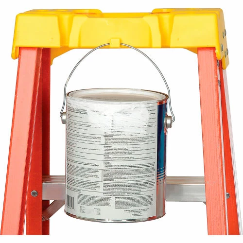 Lightweight and durable, these heavy-duty Werner® ladders are built for professional use. Plastic tool tray top for paint cans, brushes and tools. Four rivets attach top to each front rail. Back-up plates reinforce all top connectors. Full set of rear horizontals spaced one foot apart. Heavy duty internal spreaders connected with solid rivets. All steps and rear horizontals are knee-braced. Double riveted, slip-resistant Traction-Tred® steps. Wider stance for stability. Seven layer fiberglass construction.